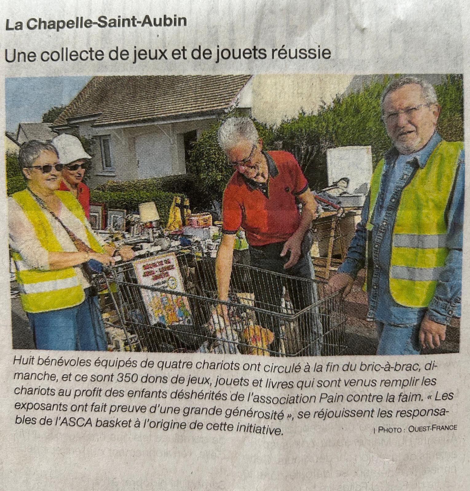 Lors du bric-à-brac du 28 septembre 2025 coorganisé par l'ASCA Basket et l'Association des Parents d'élèves de l'école de La Chapelle St-Aubin, 8 bénévoles de l'association Pain contre la faim Sarthe ont fait le tour des exposants en fin de journée afin de récolter des jeux, livres et jouets en bon état pour la fête de Noël de fin d'année.